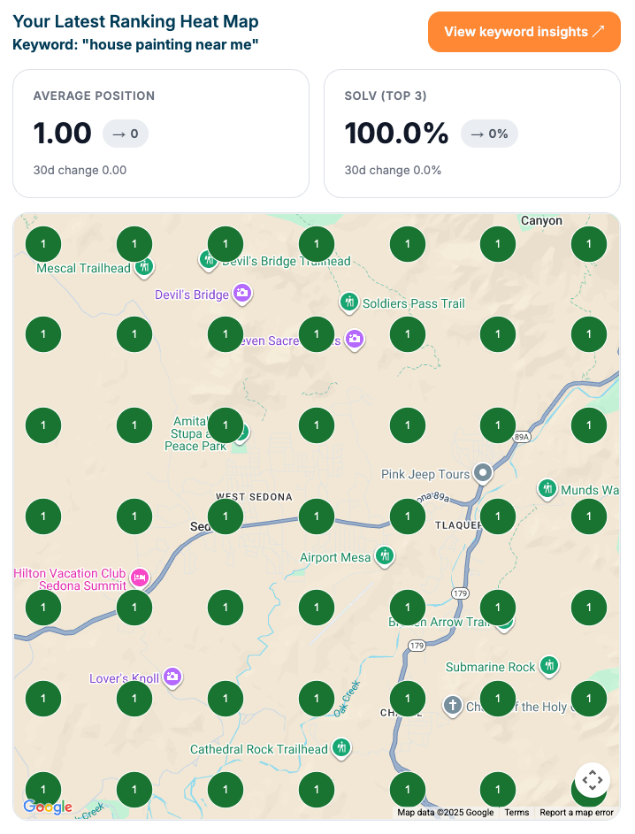 Visualize exactly how you rank for "painters near me" in specific high-value neighborhoods.